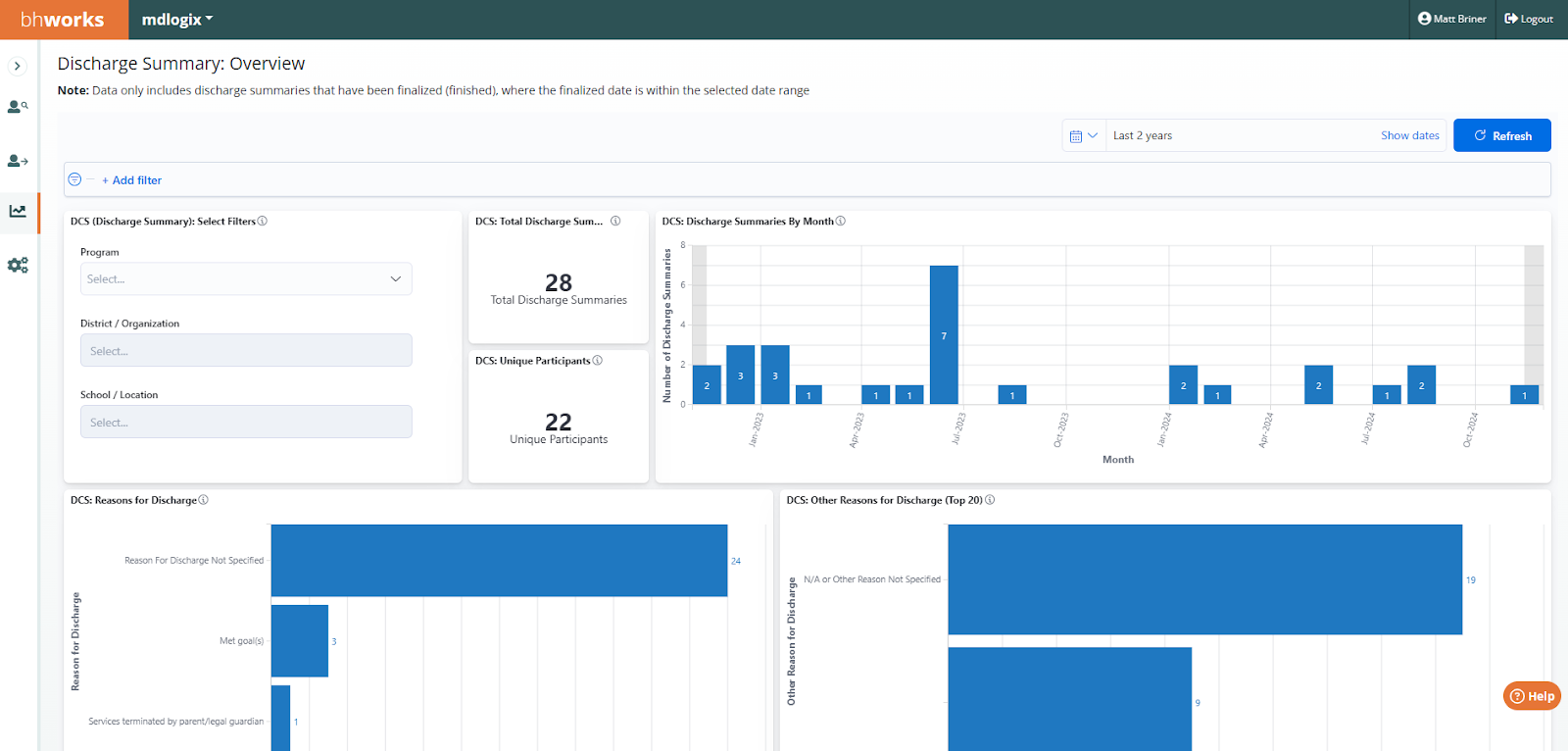 Discharge Summary: Overview - Displays de-identified aggregate data on the number of Discharge Summary records. The data includes counts for total discharge summaries as well as a count of unique participants. Graphical breakdowns display the data by demographics (gender, race, ethnicity, and age), month (finalized date) and reason for discharge. Filters allow users to drill-down by program, district/organization, and school/location.