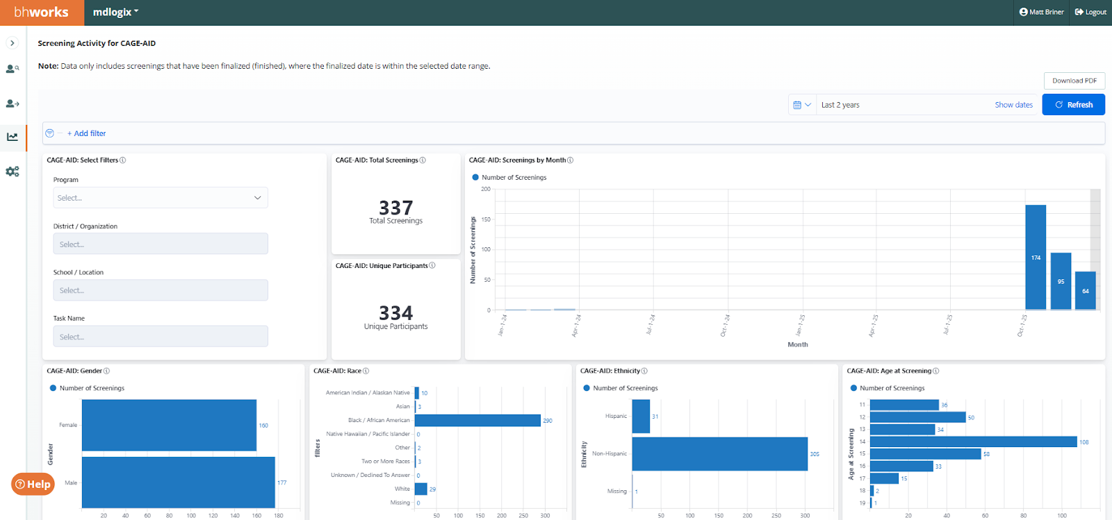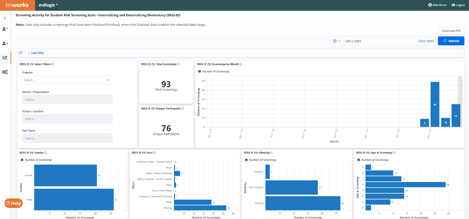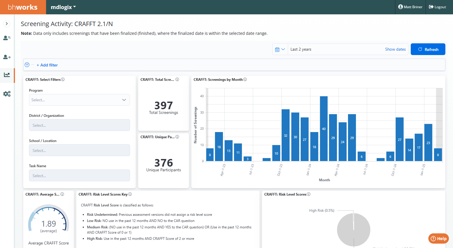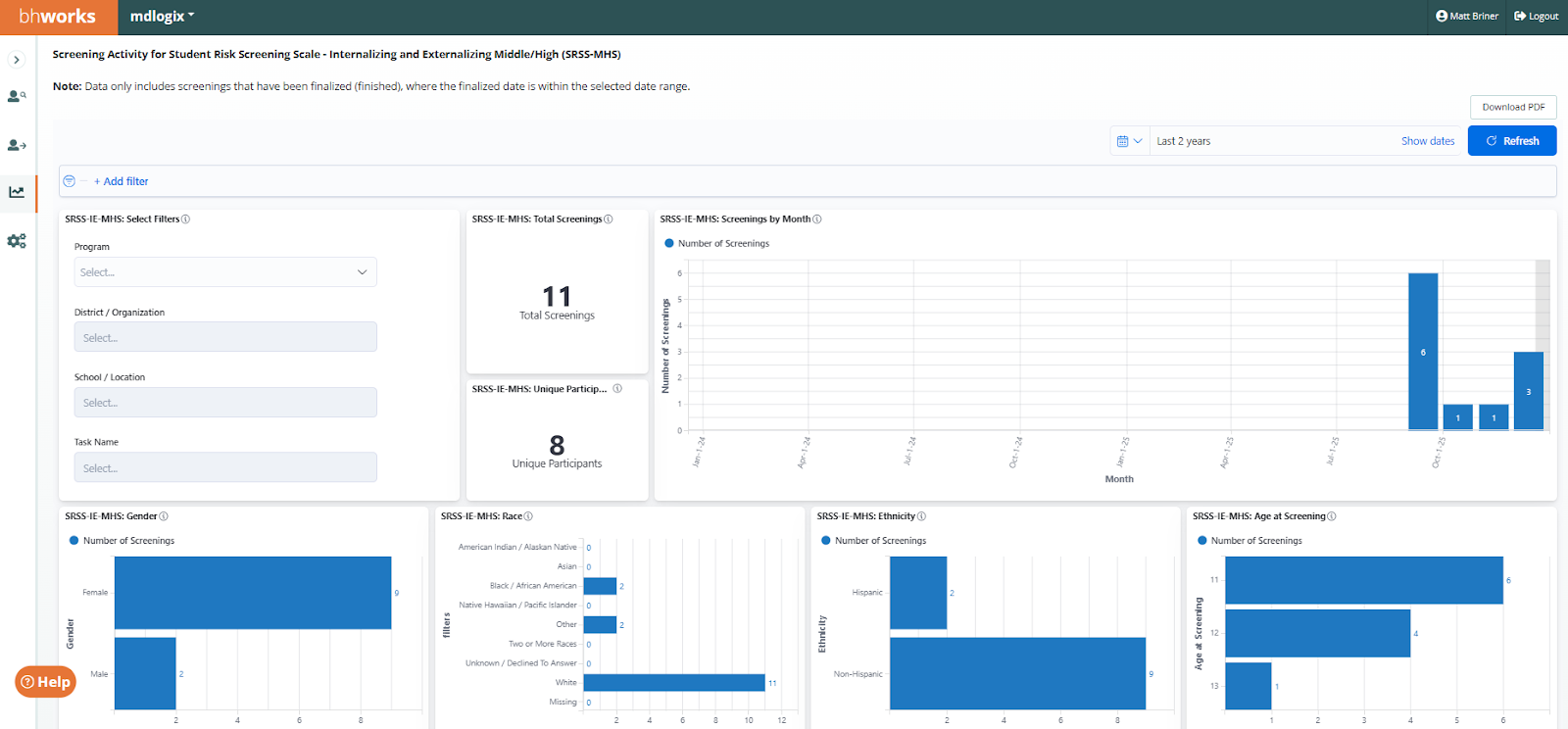 Screening Activity: BHS (Adolescent/Adult) - Displays de-identified aggregate data on the number of Behavioral Health Screen (BHS) screening records. The data includes counts for total screenings as well as a count of unique participants. Graphical breakdowns display the data by demographics (gender, race, ethnicity, and age), month (finalized date), count of screenings that met the at-risk thresholds, and average domain scores by time period (for those using repeated measures). For each domain, there are also displays of average scores, total scores, and a trend line by month. Filters allow users to drill-down by program, district/organization, school/location, and task name.