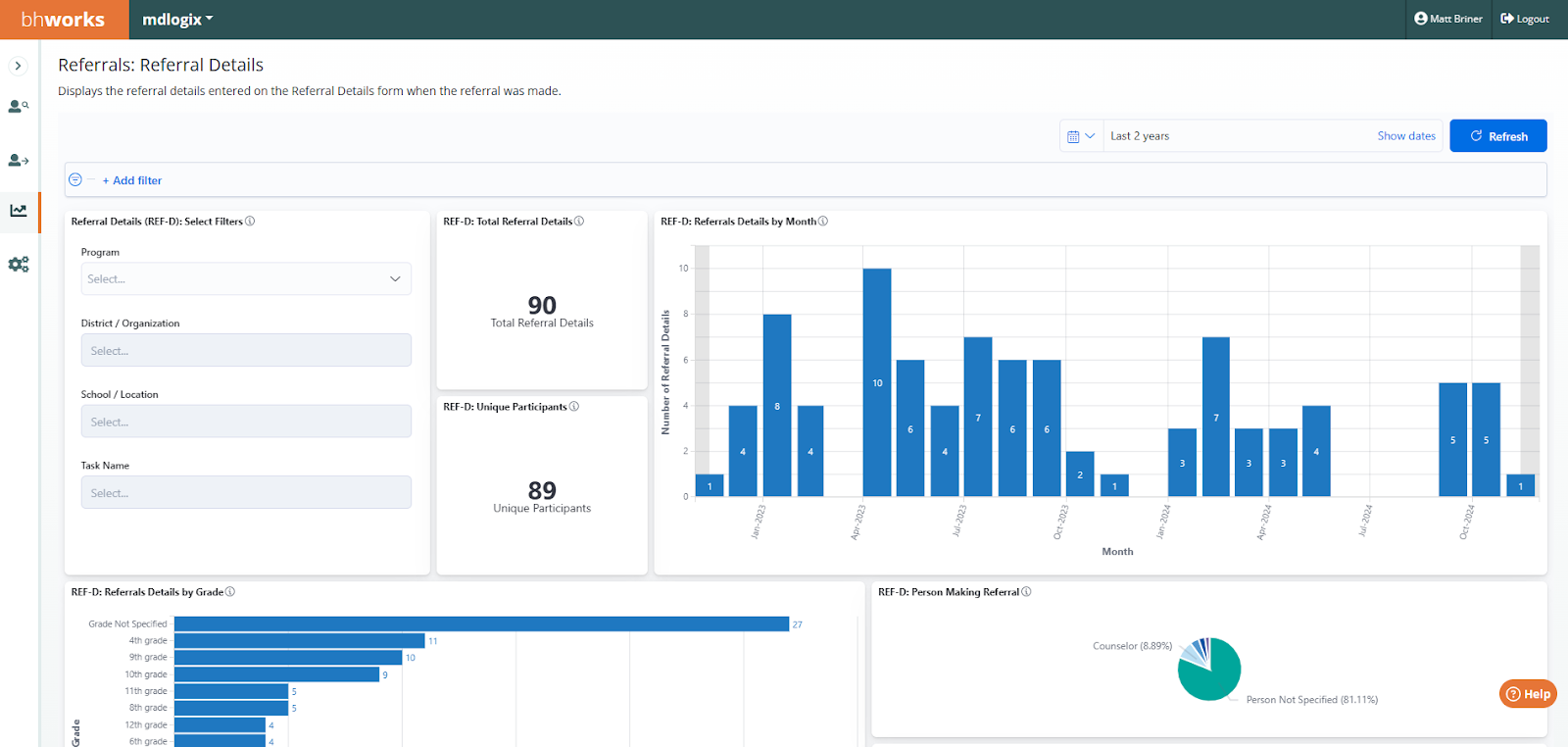 Referrals: Referral Details - Displays de-identified aggregate data on the number of Referral Details records (entered on the Referral Details form) when the referral was made. The data includes counts for total referral details forms as well as a count of unique participants. Graphical breakdowns display the data by demographics (gender, race, ethnicity, and age), month (finalized date), grade, person entering the referral, emancipated minor, secondary referral reasons, concerns regarding behavior, and current supports. Filters allow users to drill-down by program, district/organization, school/location, and task name.