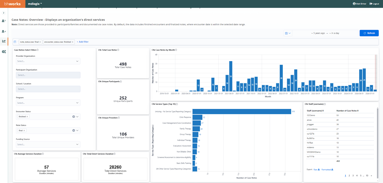 Case Notes Overview - Displays de-identified aggregate real-time data and provides an overview of case notes (services and activities) that have been entered into bhworks for an organization. Information here includes an overall count of case notes, unique participants, unique providers, and duration. Graphs breakdown the data by demographics (gender, race, ethnicity, and age), month (encounter date), service type, staff, service name, service strategy, and reasons to treat. Filters allow users to drill-down by program, district/organization, school/location, status, and funding source.