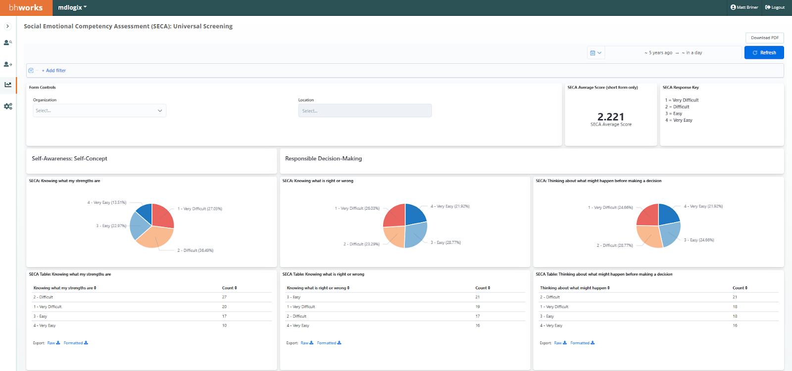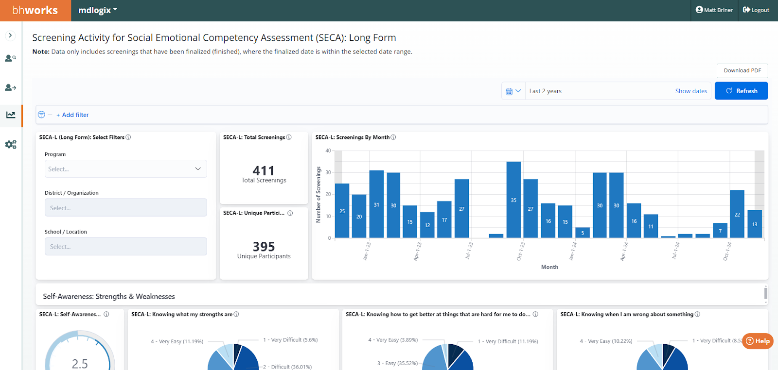 Screening Activity: SECA (Long Form) - Displays de-identified aggregate data on the number of Social Emotional Competency Assessment (SECA) Long Form screening records. The data includes counts for total screenings as well as a count of unique participants. Graphical breakdowns display the data by demographics (gender, race, ethnicity, and age), month (finalized date), average scores in each category/area, and a breakdown of each question’s responses within each category/area. Filters allow users to drill-down by program, district/organization, and school/location.