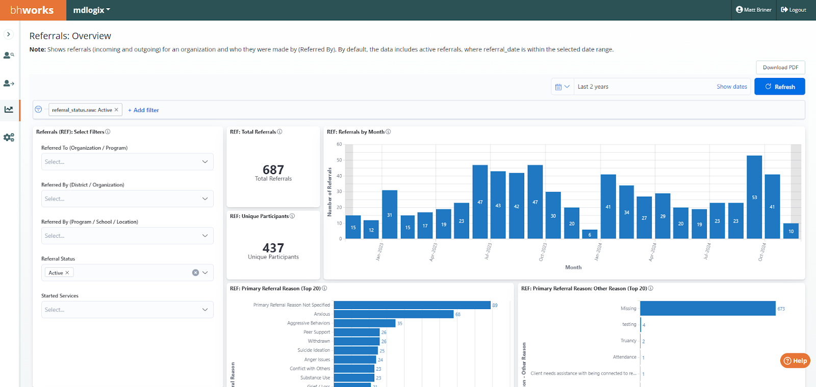 Referrals: Overview - Displays de-identified aggregate data on the number of referrals (incoming and outgoing) for an organization. The data includes counts for total referrals as well as a count of unique participants. Graphical breakdowns display the data by demographics (gender, race, ethnicity, and age), month (referral date), primary referral reason, referral made by, referral made to, started services status, reason not started services, entered by user, and acknowledged by user. Filters allow users to drill-down by referred to, referred by, referral status, and started services status