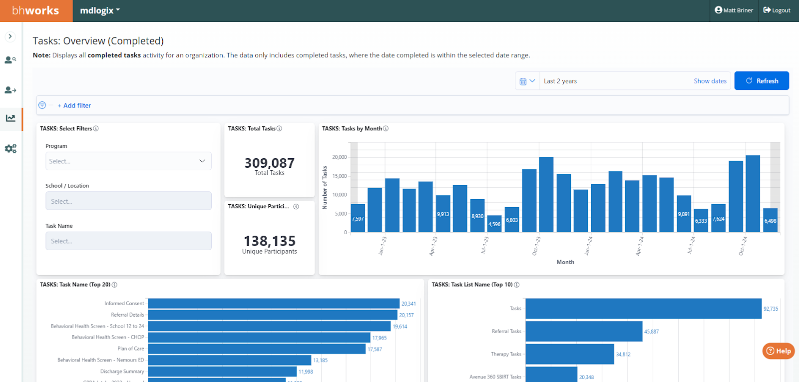 Tasks: Overview (Completed) - Displays de-identified aggregate data on the number of completed tasks (includes electronic forms as well as non-form tasks). The data includes counts for total tasks (completed) as well as a count of unique participants. Graphical breakdowns display the data by month (completed date), task name, and task list name. Filters allow users to drill-down by program, school/location, and task name.