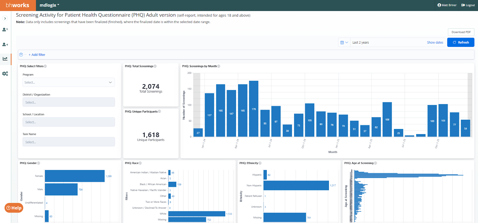 Screening Activity: PHQ (Adult) - Displays de-identified aggregate data on the number of Patient Health Questionnaire (PHQ) screening records. The data includes counts for total screenings as well as a count of unique participants. Graphical breakdowns display the data by demographics (gender, race, ethnicity, and age), month (finalized date), average score, total scores, average score by time period (for those using repeated measures), and a breakdown of each question’s responses. Filters allow users to drill-down by program, district/organization, school/location, and task name.