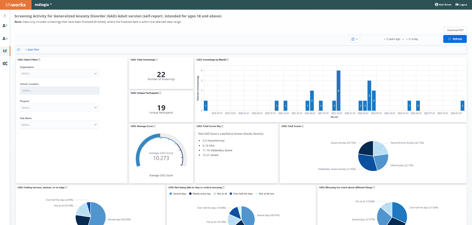 Screening Activity: GAD (Adult) - Displays de-identified aggregate data on the number of Generalized Anxiety Disorder (GAD) screening records. The data includes counts for total screenings as well as a count of unique participants. Graphical breakdowns display the data by demographics (gender, race, ethnicity, and age), month (finalized date), average score, total scores, average score by time period (for those using repeated measures), and a breakdown of each question’s responses. Filters allow users to drill-down by program, district/organization, school/location, and task name.